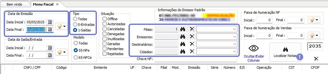Utilize os filtros de data ou cliente e clique em Localizar Notas.