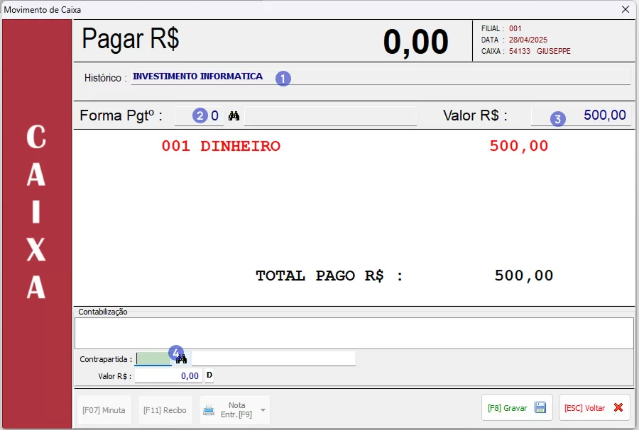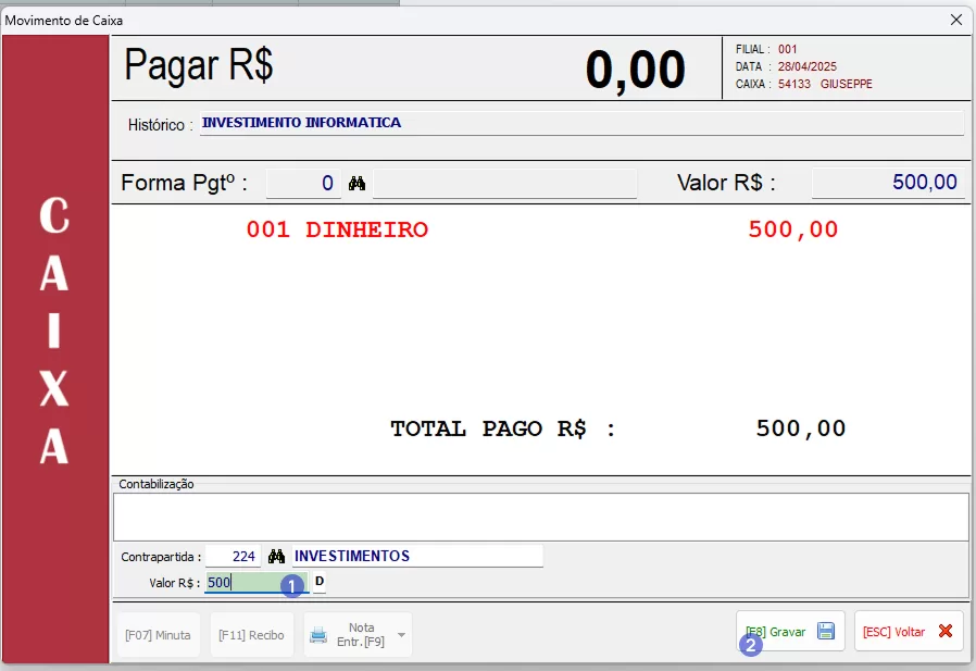 • No campo de valor, insira o valor do pagamento e pressione Enter.