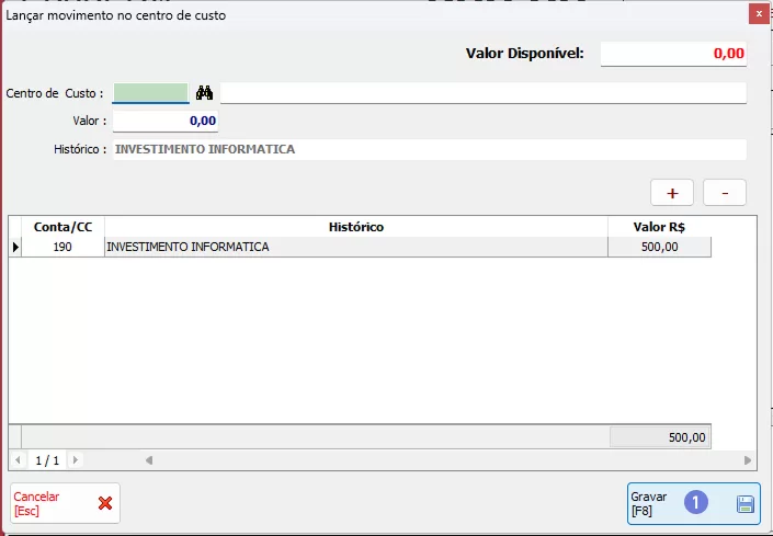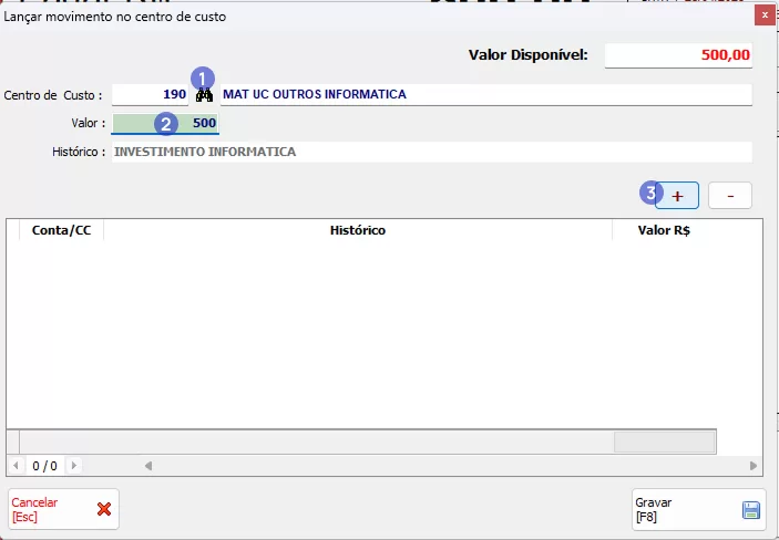 1. Na opção de Centro de Custo, use o ícone do binóculo para procurar ou digite o código do centro de custo correspondente (neste caso: “Informática”).