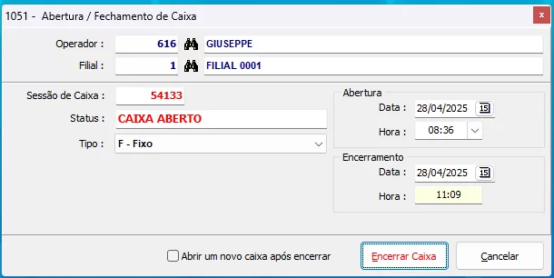 3. 1051 – Abrir/Fechar Movimento de caixa